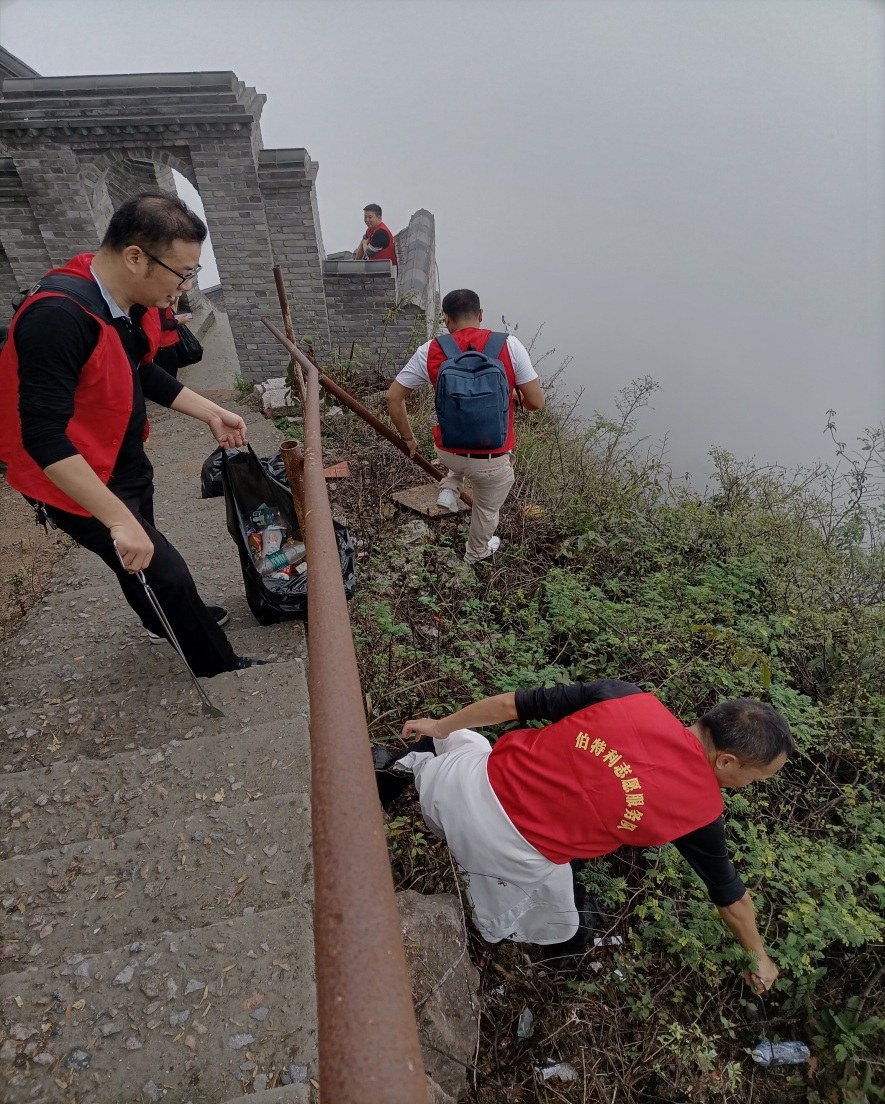 下山途中,黨員們沿途搜索,將路旁和草叢中的塑料瓶、塑料袋、食品包裝盒等垃圾用垃圾鉗一一夾入垃圾袋中,下山時把一袋袋垃圾帶到垃圾回收點,通過黨員們的隨手環保行動,東蒙山森林公園變得更加潔凈。